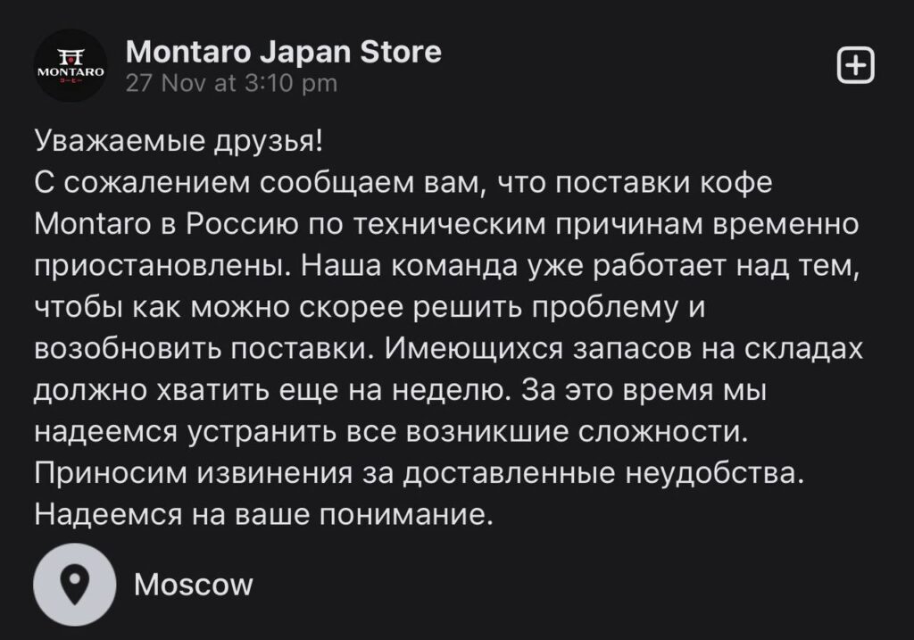 Поставщик японского кофе «Montaro» в Россию в социальных сетях сообщил о приостановке поставок напитка в нашу страну.